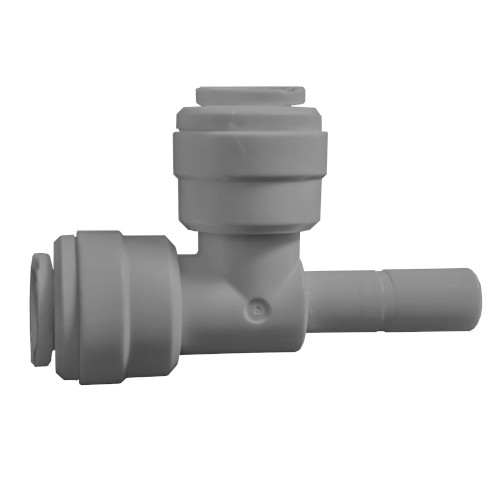 Raccordo a T con tre, un codolo laterale e due ingressi a tubo ad attacco veloce, in PP.