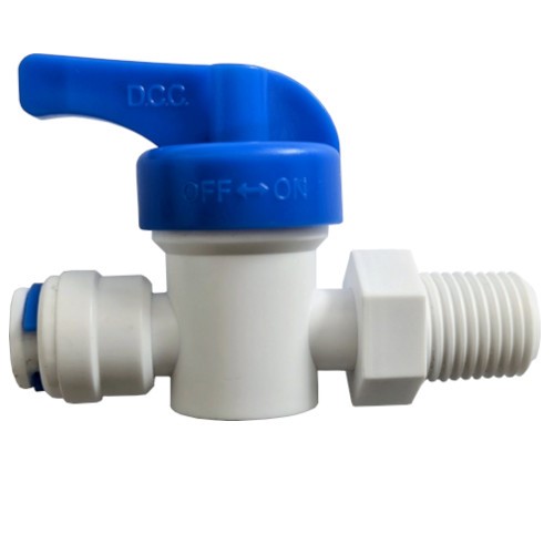 Raccordo valvola a sfera con ingresso ad attacco veloce da un lato e filettato dall’antro, entrambi 1/4″ e manopola.