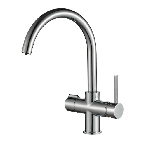 Rubinetto a 5 vie in ottone cromato con forma ad U, superficie satinata e separazione tra acqua tecnica e depurata.