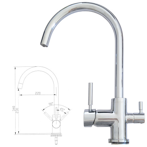Rubinetto a tre vie con collo a cigno, quindi adatto alle cucine più eleganti.