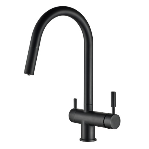 Rubinetto a 3 vie in ottone cromato con forma ad U e becco estraibile, superficie opaca nera e separazione tra acqua tecnica e depurata.