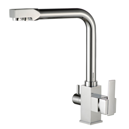 Rubinetto a 3 vie in ottone cromato con forma ad L e particolari squadrati, superficie lucida e separazione tra acqua tecnica e depurata.